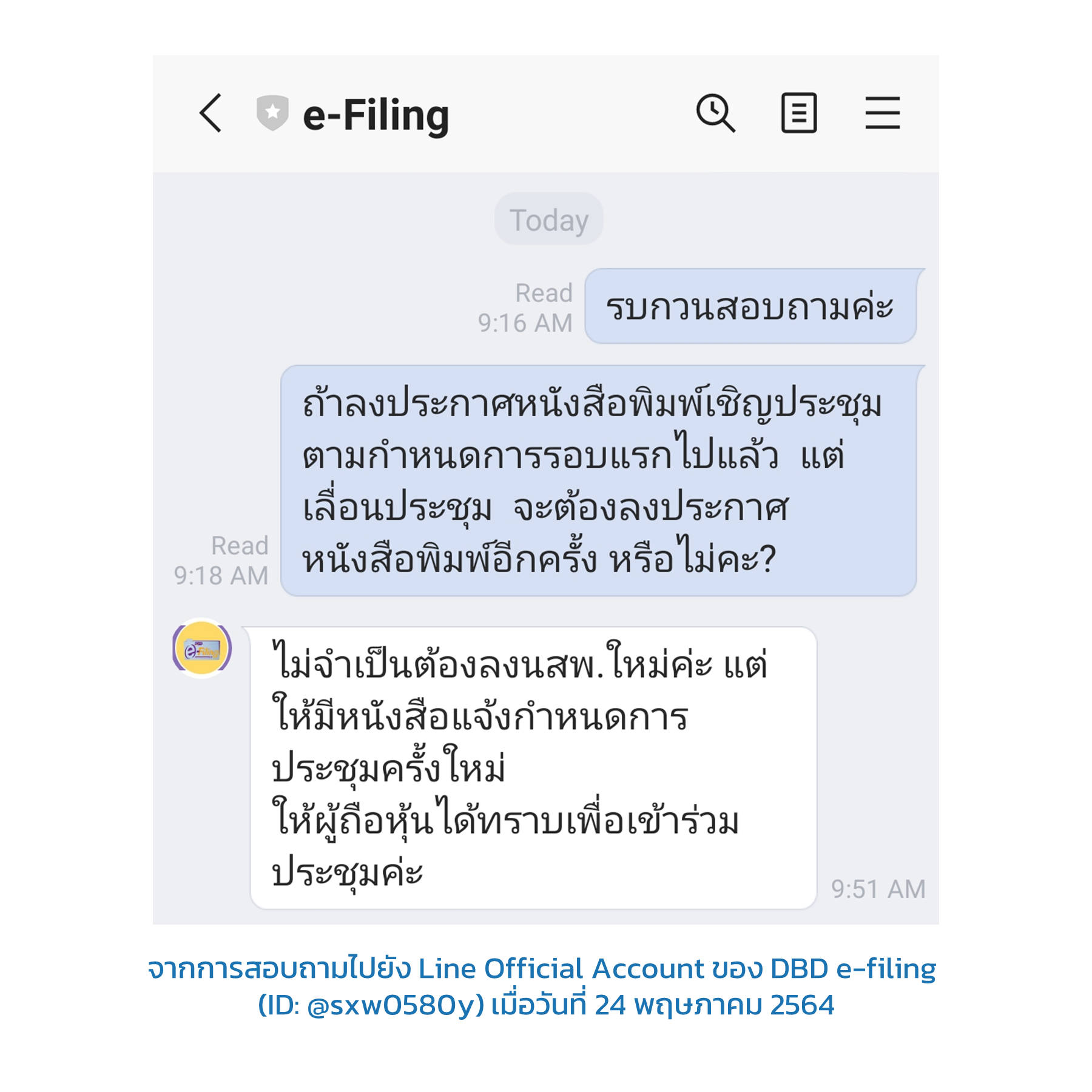 จากการสอบถามไปยัง Line Official Account ของ DBD e-filing (ID: @sxw0580y) เมื่อวันที่ 24 พฤษภาคม 2564 เราได้คำตอบดังนี้ค่ะ